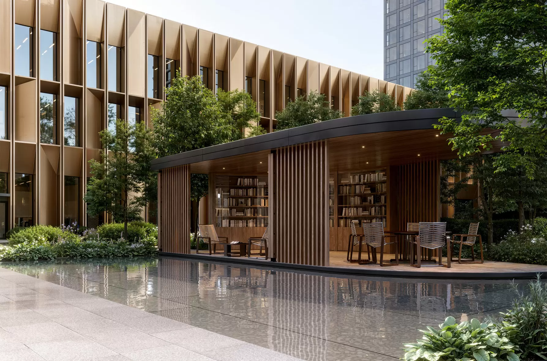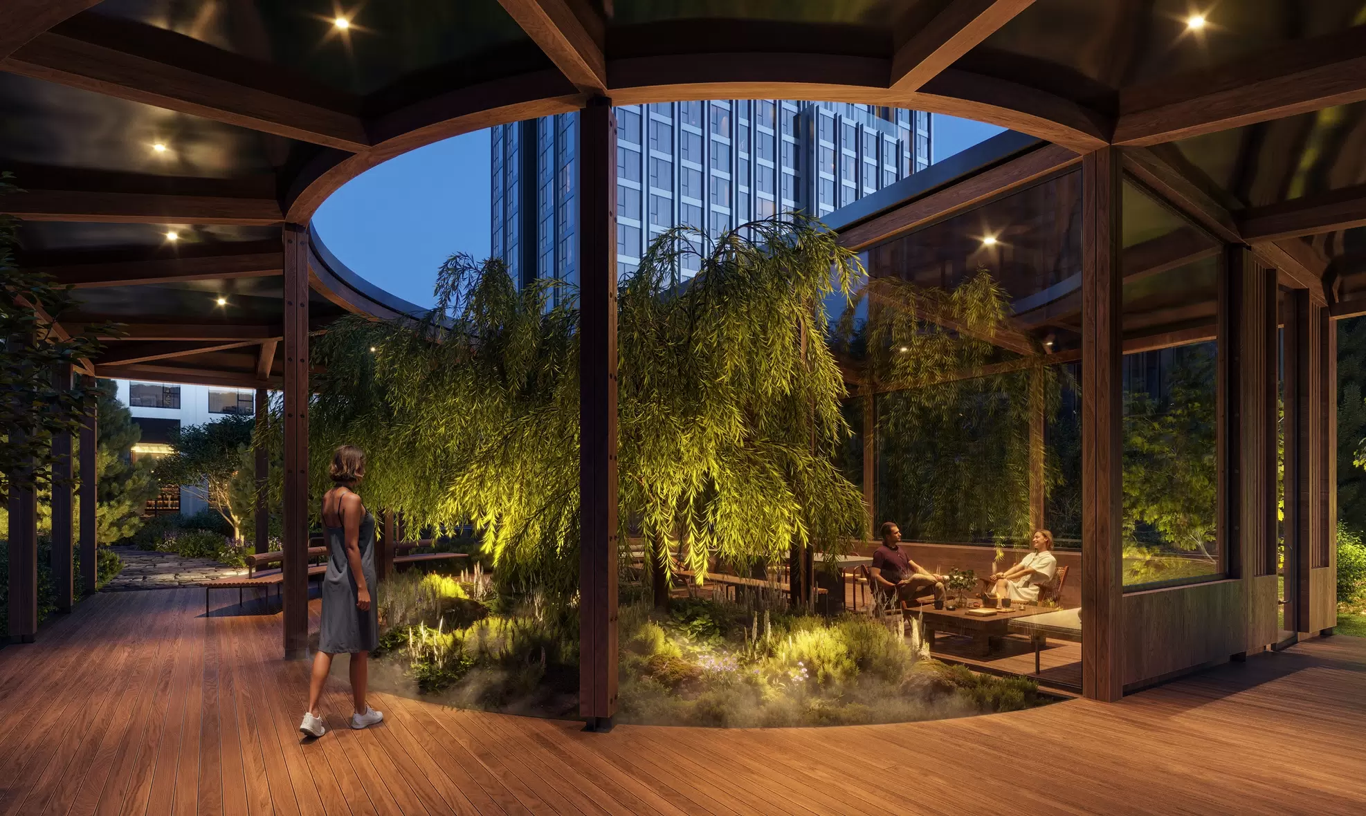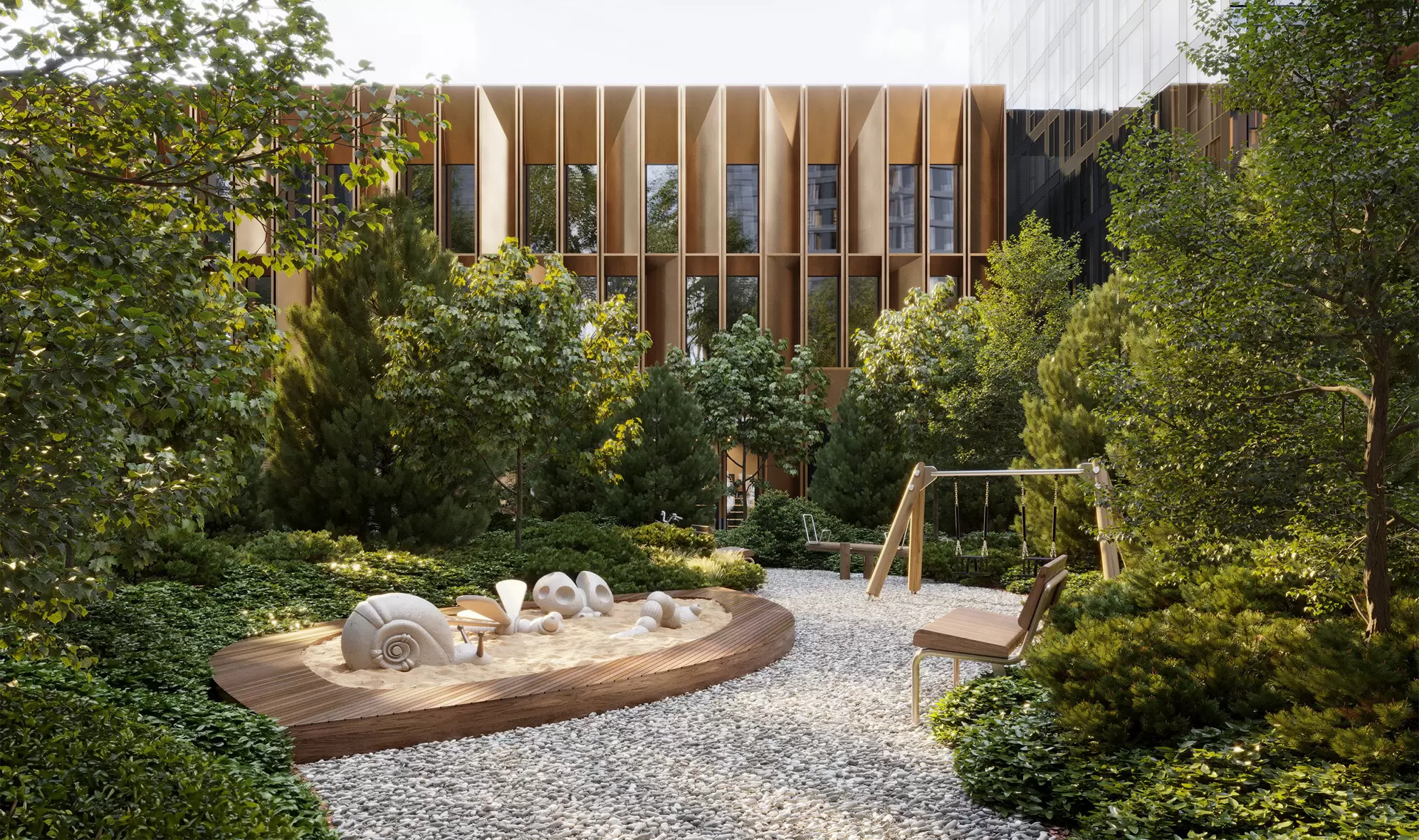 - Веерные пешеходные маршруты, зоны отдыха в окружении водоема и амфитеатров